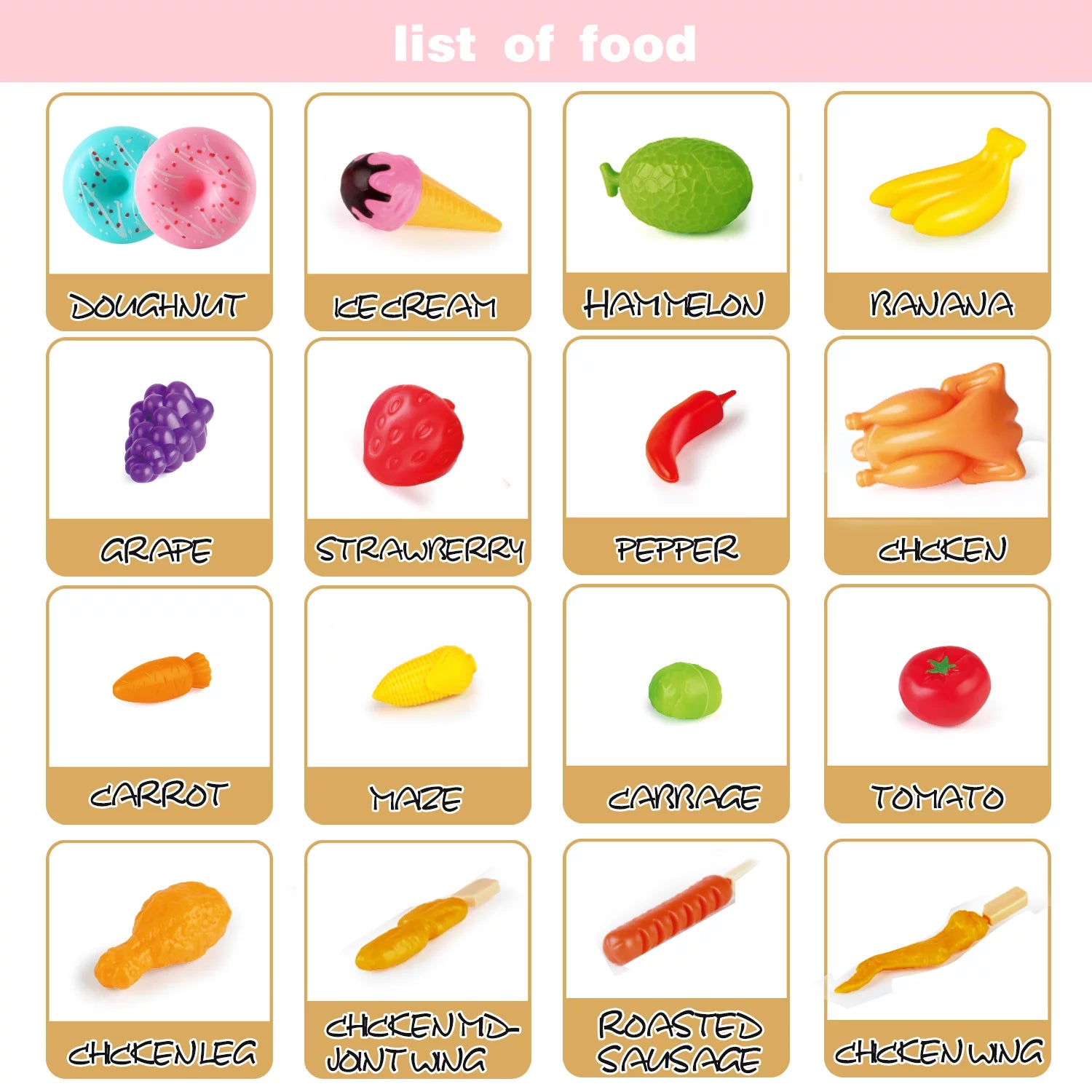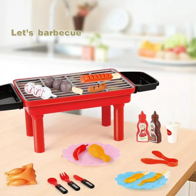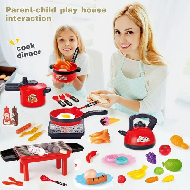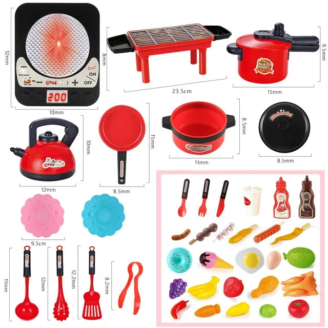 Complete Kitchen Cooking & BBQ Toy Set Each kitchen set comes with 41Pcs fun, and engaging pretend kitchen toys, include play pots and pans sets, induction cooker, kettle, bowls, plates, toy kitchen cookware, barbecue play set, knives set, food & vegetables, fast food set, and much more to provide endless hours of fun. Toy kitchen accessories are made of odorless and non-toxic ABS material, durable and washable. Perfect Gift for Kids This toy cooking and play food set is suitable for children from 3-80 years old and up Adult.