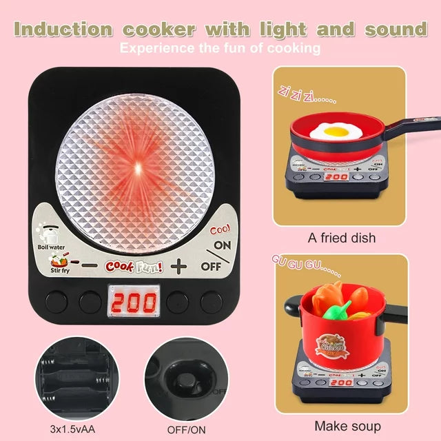 - Realistic Kitchen Playset: Pretend pressure cooker with REAL play induction cooktop with lights and sounds. Simulation kettle can be filled with water and spout can be pulled out.